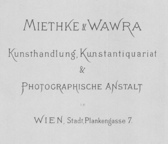 Carl Josef Wawra was apprenticed to his father, the painter and art dealer Josef Eduard Wawra, and also learned his trade in a number of antiquarian bookstores in Vienna. Together with Hugo Othmar Miethke, who came from Potsdam, he founded the company Miethke & Wawra as a general partnership on 15 October 1861. The two equal partners’ company was entered in Vienna’s Commercial Register in the category of book and antiquarian book trade in 1863. Initially run as an antiquarian bookstore and art publisher with a shop at Singerstraße 30 and a “Photographic-Artistic Institution” at Landstraßer Hauptstraße 95, the company edited photographs, reproductions, and printed works. In the 1860s, Miethke & Wawra rapidly developed into organizers of art auctions in Vienna, with the generally flourishing art trade in the metropolis on the Danube having a favorable influence on the continuous rise of Miethke & Wawra from auction house to gallery. The two entrepreneurs also established international contacts with such important art dealers as Ambroise Vollard, Paul Durand-Ruel, and Charles Sedelmayer in Paris and Paul Cassirer in Berlin. During the 1873 World’s Fair in Vienna’s Prater, Miethke & Wawra managed to rent exhibition rooms at the Künstlerhaus and present the monumental painting Venice Pays Homage to Katharina Cornaro (1872/73, Belvedere, Vienna), which had been commissioned from Hans Makart, in a most spectacular setting. In the subsequent year, however, the two art dealers went separate ways.