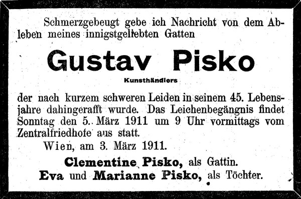 Obituary Gustav Pisko, in: Neue Freie Presse, 04.03.1911.