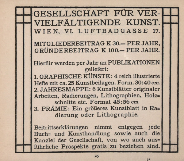 Advertising for membership of the Society for Reproducing Art, in: Vereinigung bildender Künstler Österreichs Secession (Hg.): XX. Ausstellung der Vereinigung bildender Künstler Oesterreichs Secession Wien. März April Mai 1904, Ausst.-Kat., Secession (Vienna), 26.03.1904–12.06.1904, Vienna 1904.