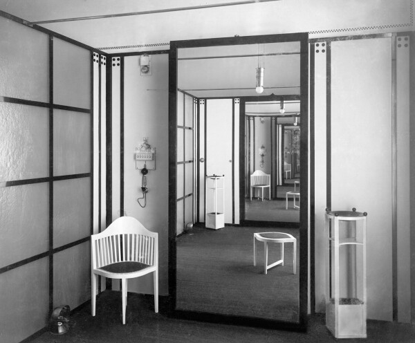 The Wiener Werkstätte, which had been founded in 1903, was entrusted with the interior decoration of the new fashion salon. Josef Hoffmann and Kolo Moser designed furnishings for the shop that stood out for their simplicity and geometric style. The two artists were also responsible for all sorts of printed matter, wallpapers, and textile labels, thus creating the company’s corporate identity in the sense of a Gesamtkunstwerk or universal work of art. Articles published in the Viennese art magazine Hohe Warte in 1904 and in the periodical Deutsche Kunst und Dekoration the following year offered glimpses of the rooms.