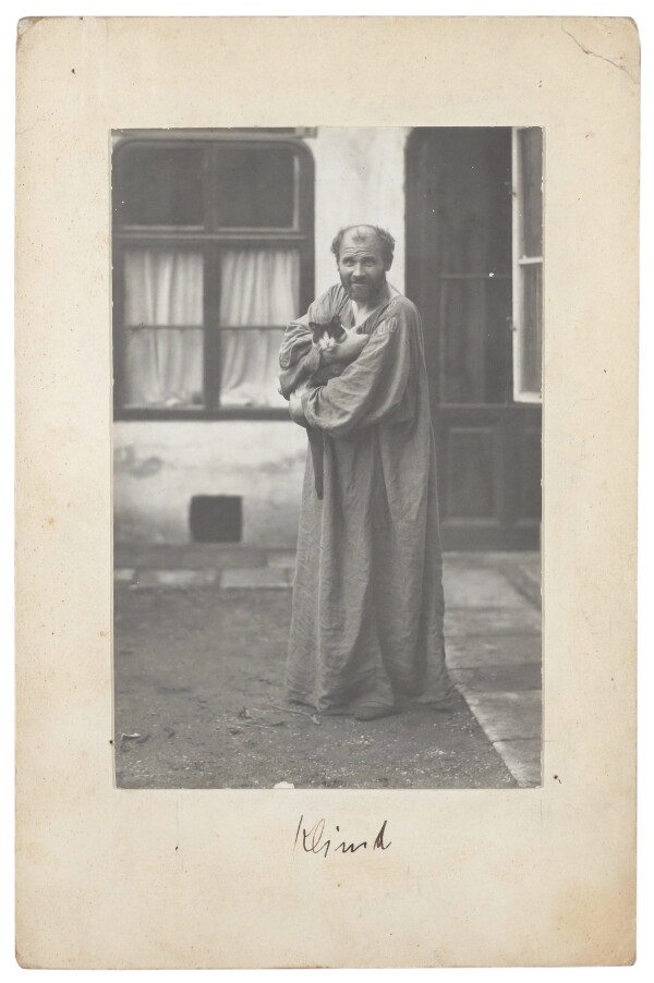 Moriz Nähr: Gustav Klimt with a cat in front of his studio in Josefstädter Straße, May 1911, Klimt Foundation