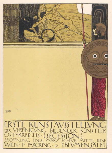 The first exhibition of the Vienna Secession took place in the flower halls of the Imperial-Royal Horticultural Society on Parkring (Vienna’s First District, Inner City). Klimt designed the poster for the show, which could only be placarded in its censored version. The cover of the May/June issue of Ver Sacrum likewise showed this motif by Klimt. Emperor Francis Joseph I (1830–1917) visited the show and was given a tour of the premises by Klimt and Carl Moll (1861–1945). The Vienna Secession’s second exhibition opened in November, in the new Secession building designed by Joseph Maria Olbrich (1867–1908) near the Naschmarkt (Vienna’s First District, Inner City).