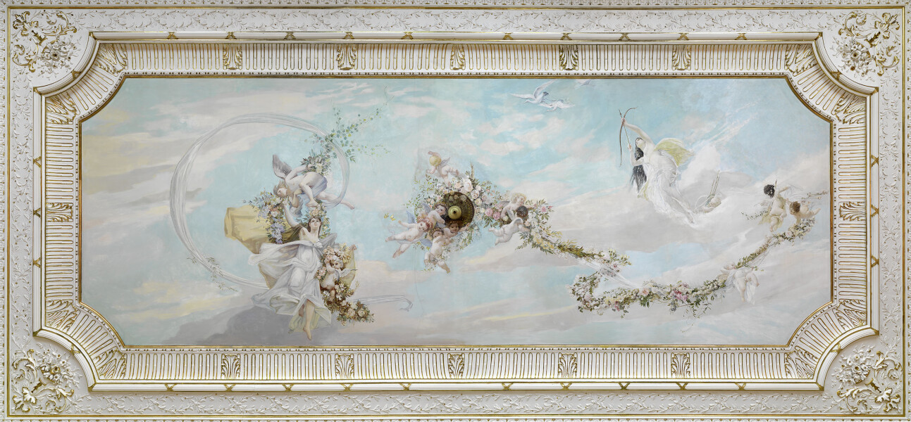 The young painters were offered to share a studio at the School of Arts and Crafts. It was the birth of the collective known today as “Künstler-Compagnie.” In 1880, while still training as decorative painters, they received one of their first commissions, designing four ceiling paintings for the parlor of the Sturany Palace in the Inner City (Vienna’s First District). Shortly thereafter they were entrusted with the ceiling paintings for the spa building of Karlsbad (now Karlovy Vary).