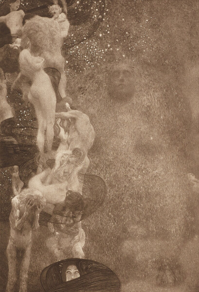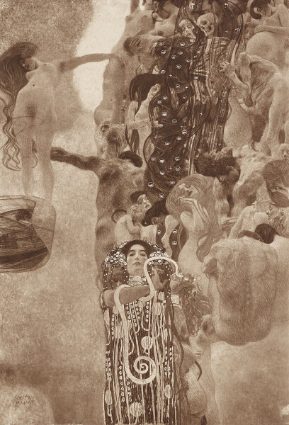 Klimt participated in several exhibitions. At the Vienna Secession’s 18th exhibition, the so-called “Kollektiv-Ausstellung Gustav Klimt” [“Gustav Klimt Collective Exhibition”], he presented more than eighty works. All three of the Faculty Paintings were shown together for the first time in their current, not yet completed states. Hope I was also on view. However, Minister of Education Wilhelm Ritter von Hartel (1839–1908) intervened due to the showcased nudity of a pregnant woman, which led to the withdrawal of said painting. Due to the resulting rehanging, the opening had to be postponed for four days.