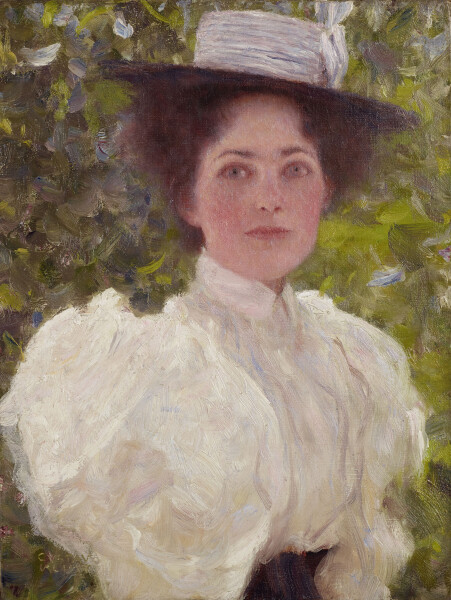 He spent the summer in St. Agatha in the Salzkammergut with the Flöge family, painting his first large-sized landscapes in portrait format. Having also becoming a portraitist of Viennese society, Klimt immortalized Sonja Knips (1873–1938) in oil on canvas. This was his first portrait in square format. Around the same time, he also captured the young Maria Ucicka (1880–1928), a model and mother of his first son, in the small-sized, intimate portrait Girl in the Foliage.
