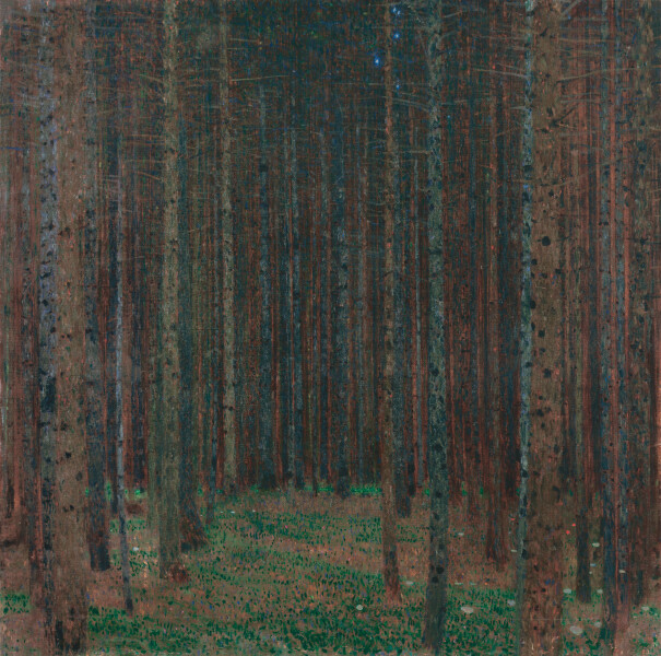 As usual, Klimt spent the summer at the Attersee. Inspired by the picturesque surroundings of the village of Litzlberg, he painted several mystical forest views, such as Pine Forest I. The cropped view and painting style reveal borrowings from photography. The picture is reminiscent of the photograph Forest Interior, which Moriz Nähr (1859–1945), Klimt’s favorite photographer, had taken about ten years earlier. During his summer retreat, Klimt worked on the transfer sketches for his monumental work The Beethoven Frieze, which was to be presented at the Vienna Secession the coming year.