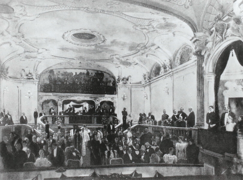 Laufberger died in 1881, and his class was taken over by Julius Victor Berger (1850–1902). He, too, allowed the young trio of painters to assist him in his projects, such as in the decoration of the Zierer Palace (no Palais Kranz, Vienna’s Fourth District, Wieden). In 1882 followed the commission for the decoration of the Brno Municipal Theater. That year, they also began tackling their first major independent commission for the Municipal Theater of Reichenberg (now F. X. Šalda Theater, Liberec).