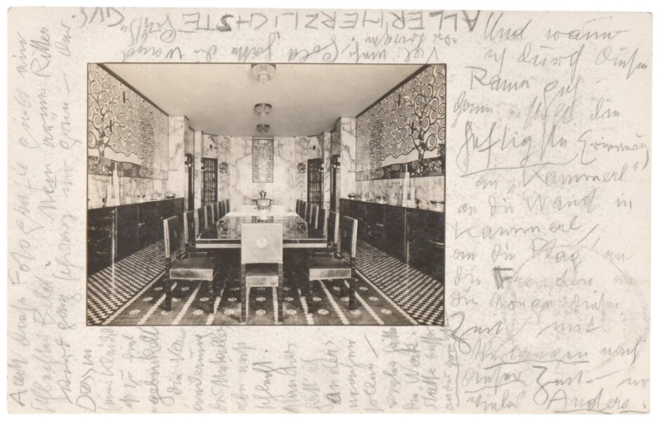 In May he visited the Stoclet Palace in Brussels, about which he raved in a picture postcard to Emilie Flöge. Only the imposing mosaic frieze in the dining room did not quite come up to his expectations.