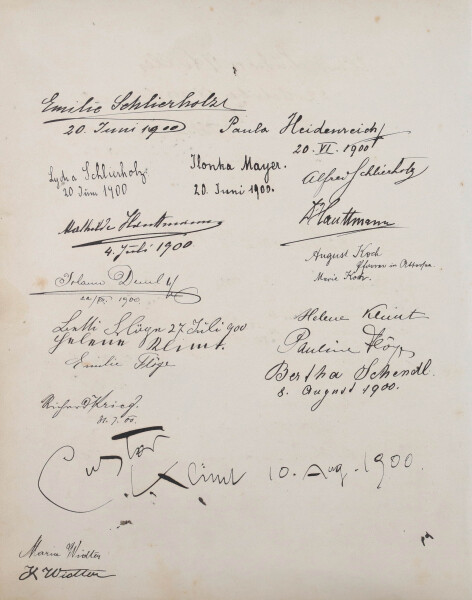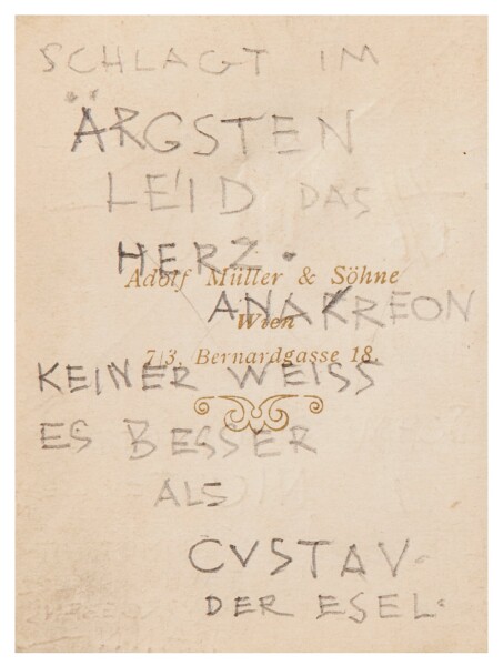 The relationship between the artist and Emilie Flöge became more and more intense. On 16 February 1895, he entered his name in Flöge’s dance card for the “Trachtenkränzchen,” a traditional costume ball organized by the Vorarlberg Society in Vienna, adding freely quoted lines by the Greek poet Anacreon. In the summer, the two of them, seeking recreation, spent time together in Langenwang in Styria.