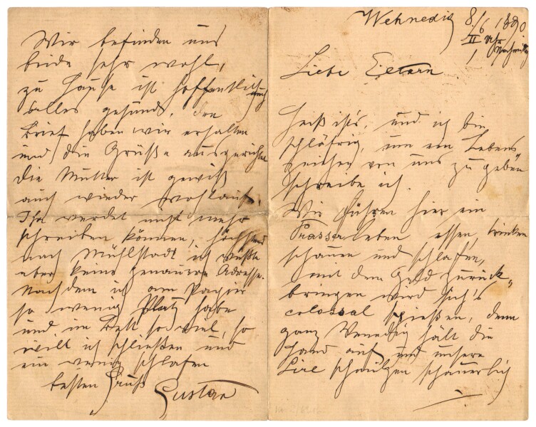 Klimt’s earliest known letter to Maria Ucicka was sent on 12 June. Their son Gustav Ucicky (d. 1961) was born in July. Only a few months later, in September, Gustav Zimmermann (d. 1976), the son of Maria “Mizzi” Zimmermann and Klimt, was born.