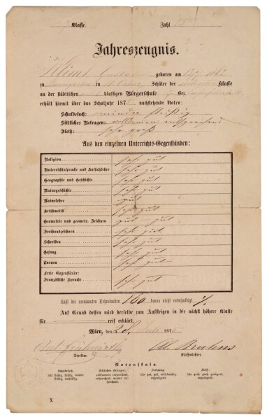 In 1878/79, Gustav Klimt and Franz Matsch were admitted to the “School for Drawing and Painting,” which was headed by the school’s director, Ferdinand Laufberger (1829–1881). Ernst would follow in the subsequent year. They received a scholarship of 20 florins per month.