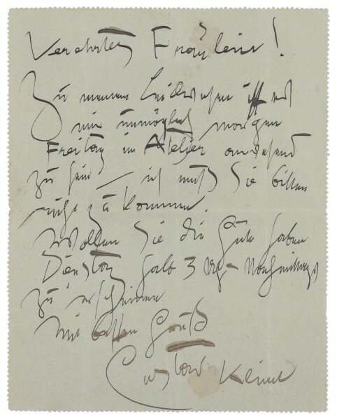 Arthur Schnitzler (1862–1931) and his wife visited Klimt in his Hietzing studio. The writer had received one of the master’s drawings for his birthday and came to have it signed. Wiener Werkstätte muse Friederike Maria Beer (1891–1980) also made an appearance at the artist’s studio to engage Klimt for a portrait commission. The contact had been established by the painter Hans Böhler (1884–1961). A year earlier, Beer had been portrayed by Schiele.